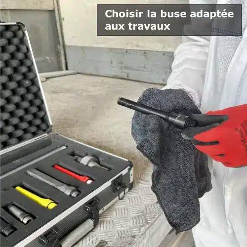 Il est important de nettoyer régulièrement les buses pour éliminer les contaminants et prolonger leur durée de vie. Les buses doivent également être remplacées en cas de déformation (écrasement par chariot élévateur…). La dureté de la glace carbonique étant comparable à celle de la craie, il n’y a pas ou très peu d’érosion.