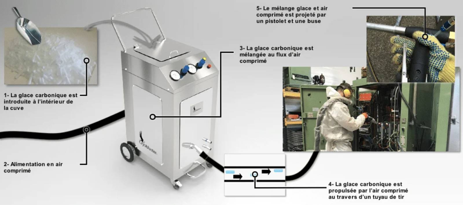 Le procédé utilise la glace carbonique (dioxyde de carbone solide) ayant la dureté de la craie, ce qui permet de nettoyer les surfaces tout en douceur. Le nettoyage se fait par la projection de la glace carbonique au moyen de blasters et d’air comprimé. La glace carbonique sous forme de pellets de 3 mm est introduite au sein du blaster ou machinie de nettoyage cryogénique à l’intérieur de la cuve ou trémie (1).