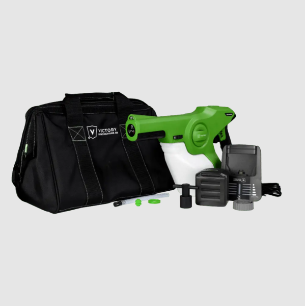 Le pistolet électrostatique Victory spécial désinfection, permet de couvrir entre 150 à 175 m² avec un seul réservoir de 1 litre de solution et permet donc une économie jusqu’à 65% de produit par rapport à un système de pulvérisation traditionnel (manuel ou électrique).